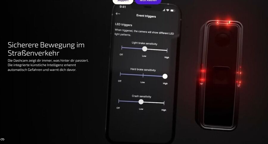 So hast du vorne am Lenker auf deiner Dashcam App