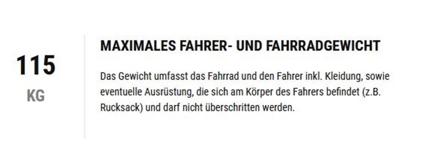 Maximales Fahrer- und Fahrradgewicht 115 kg