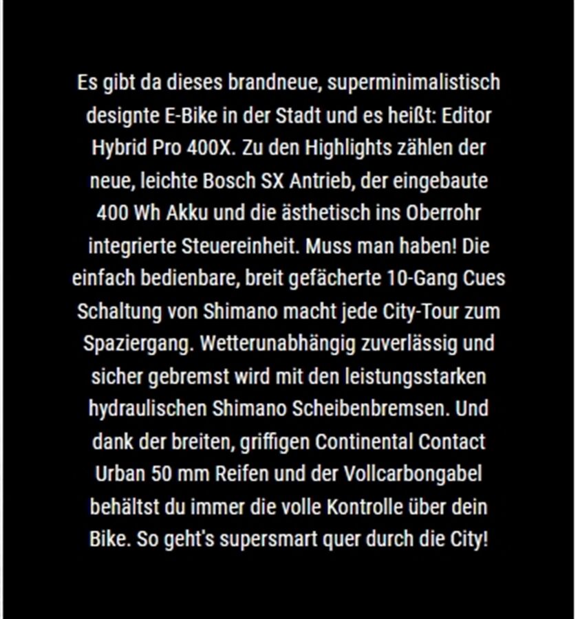 Artikeldetails für CUBE Editor Hybrid Pro 400 SX 50cm 17,2 kg 2025 (black´n´spectral)