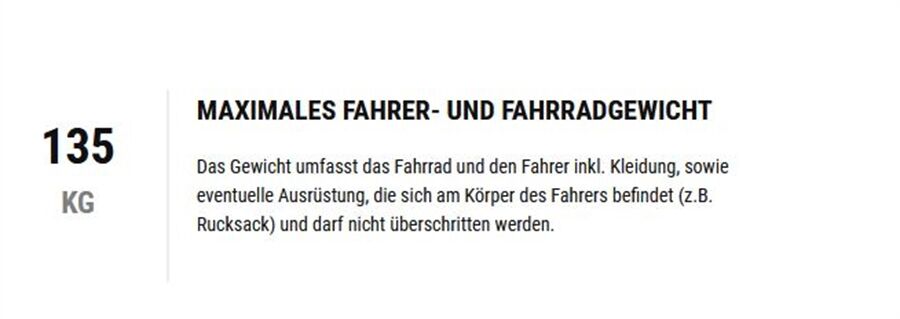 Maximales Fahrer- und Fahrradgewicht 135 kg
