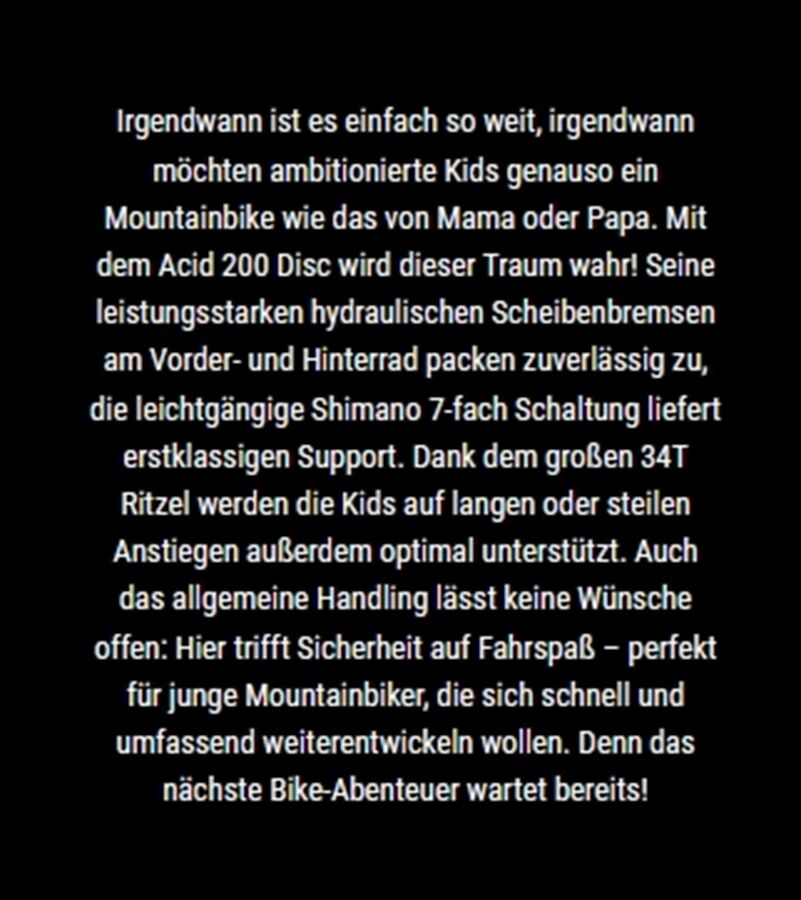 Technische Daten für MTB Acid 200 Disc 20" 9,3kg 111-124cm 7GangR 2026