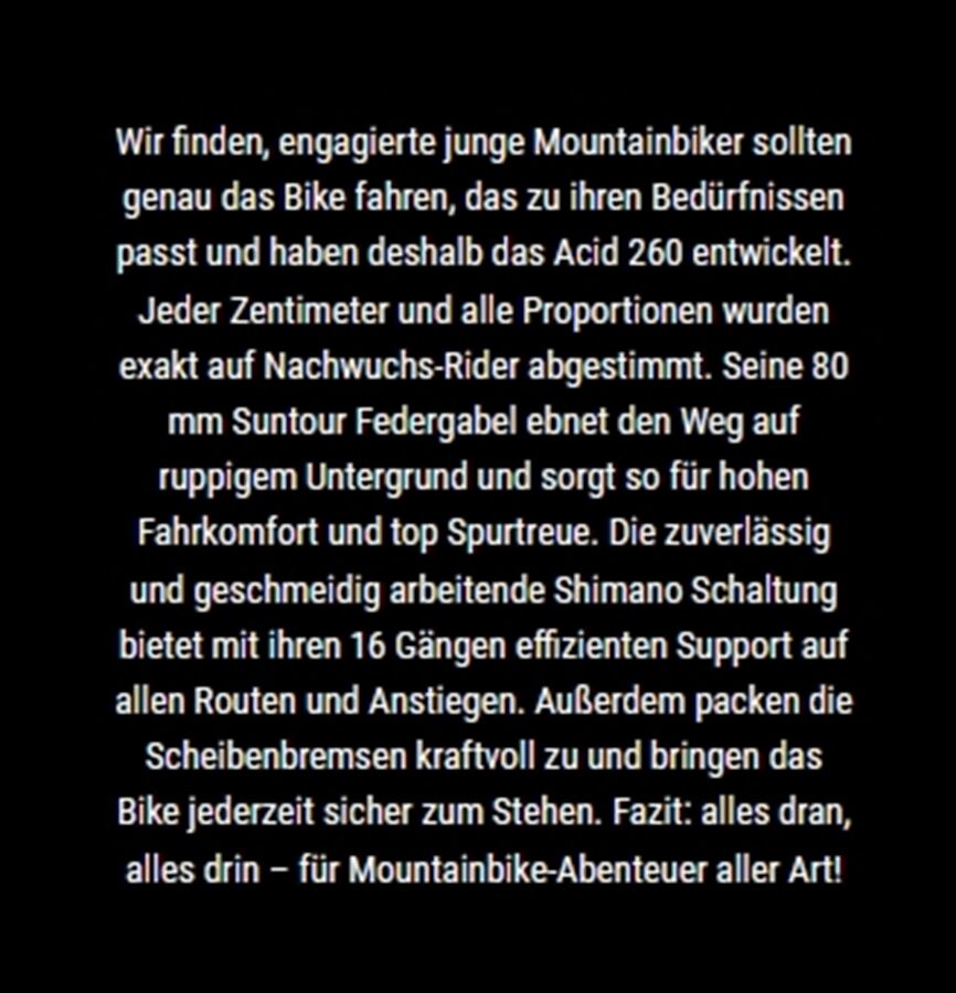Technische Daten für MTB Acid 260 Disc 26" 13,8kg 8GangR 124-141 2026