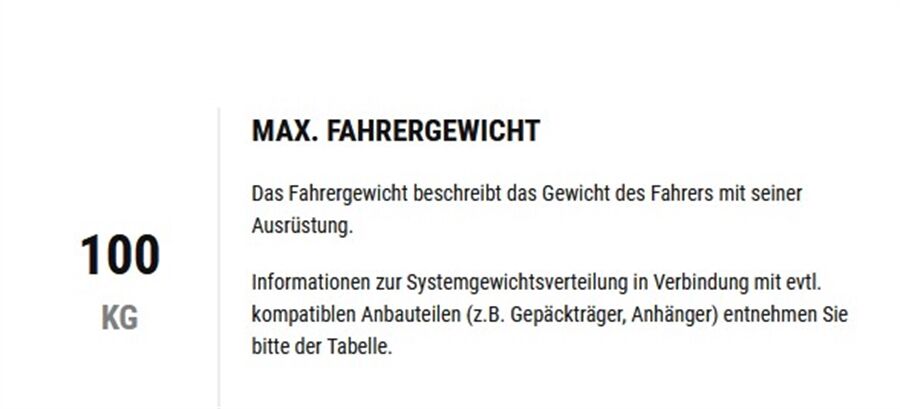 Max. Fahrergewicht 100 kg