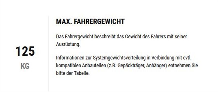 Max. Fahrergewicht 125 kg