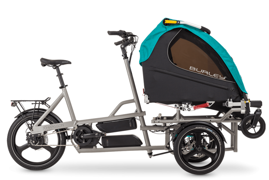 Der Burley Encore X Fahrradanhänger für zwei Kinder kann ohne Räder mit Hilfe unseres Montagesets vor dem Fahrer auf dem Lastenrad montiert werden.