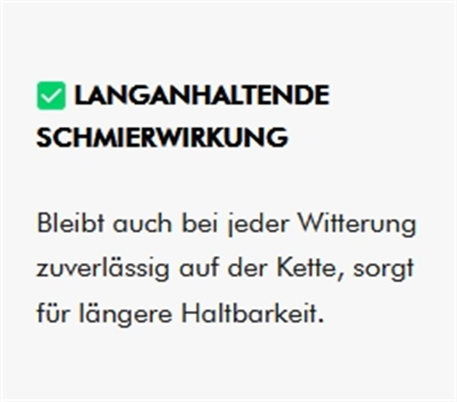 Im Gegensatz zu festen Wachsen hält hält die Schmierung mit Ölen deutlich länger. Dies gilt nicht für das TUNAP Kettenwachs!